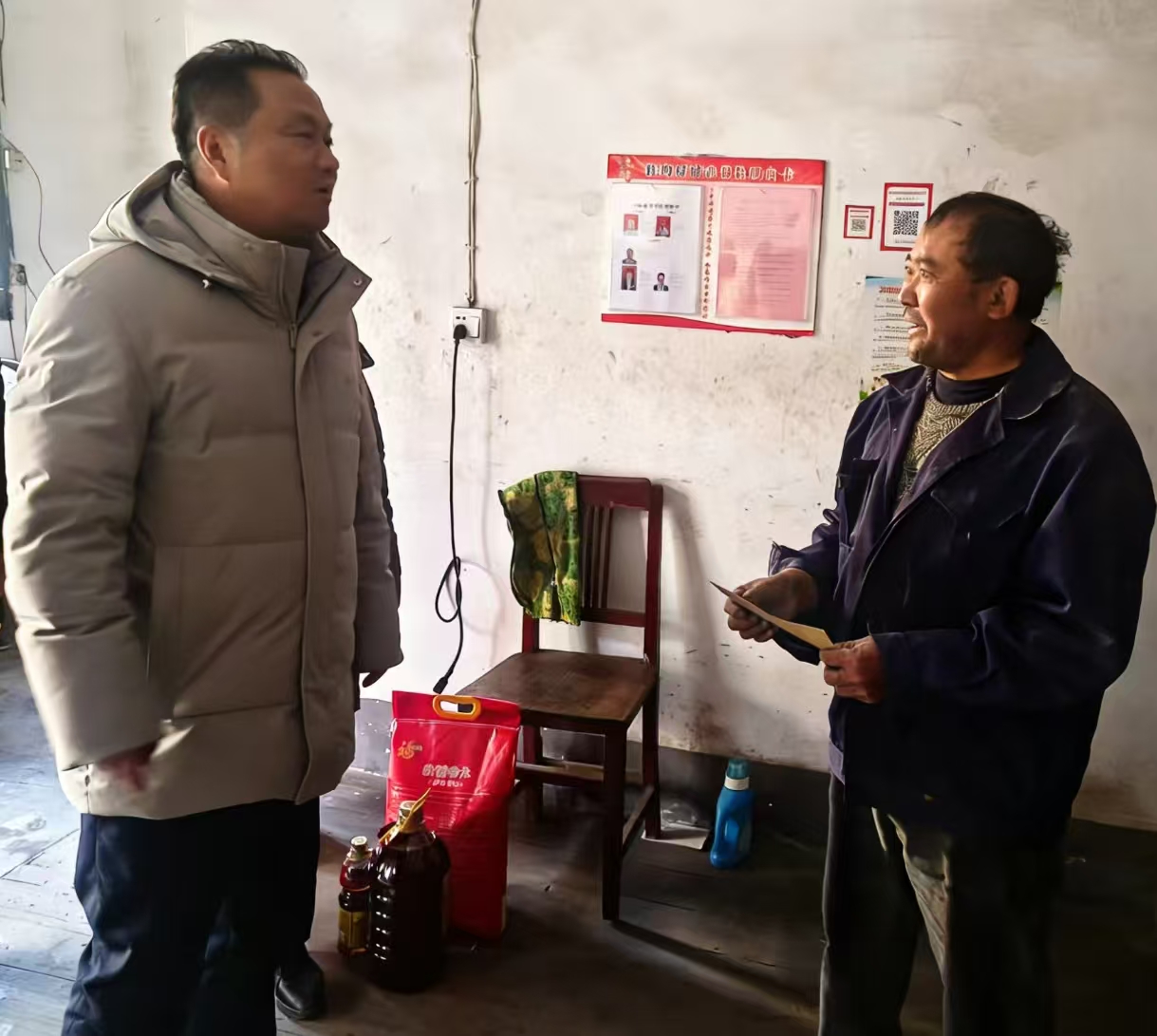 慰问组一行循着乡间小路,逐一走进困难群众家中,与他们亲切交谈,详细询问身体状况、家庭收入、医疗保障以及过冬物资储备等情况,了解当前生活中存在的实际困难,并送上米、油等慰问品和慰问金。唐永春叮嘱大家要注意防寒保暖,保重身体,鼓励他们坚定信心,在党委、政府的政策帮扶和自身努力下,逐步改善生活条件,把日子过得越来越好。